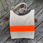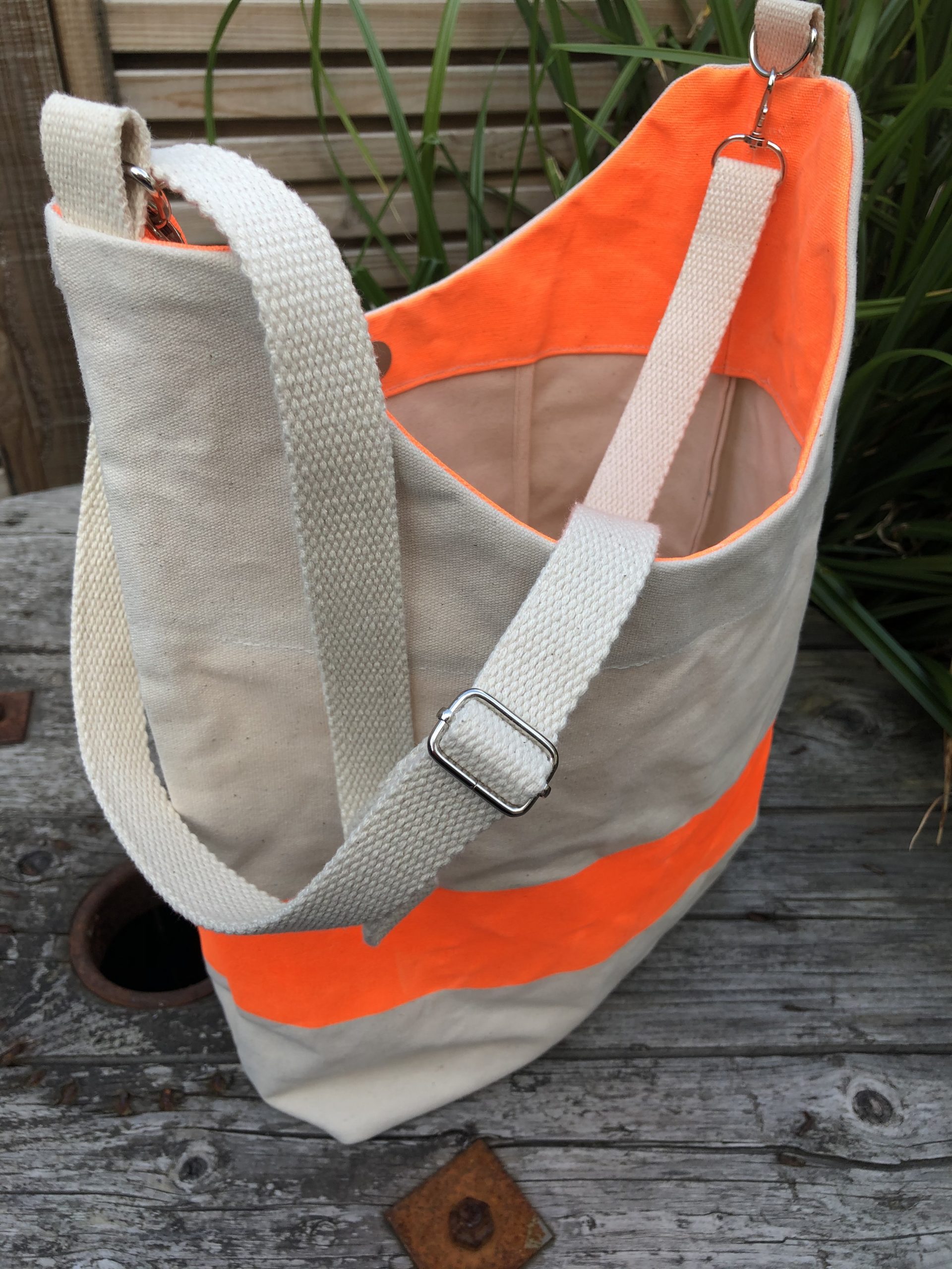Available in the ‘natural’ shade of canvas, with a sturdy, woven 100% cotton strap, this 10 litre bag (at least) has a bright orange 7cm wide stripe, double stitched French side seams and a triple stitched rectangular base secured with binding to provide a clean, unfussy interior. As far as possible, all materials are sourced from the UK (excluding the strap adjuster, D links and swivel hooks.)